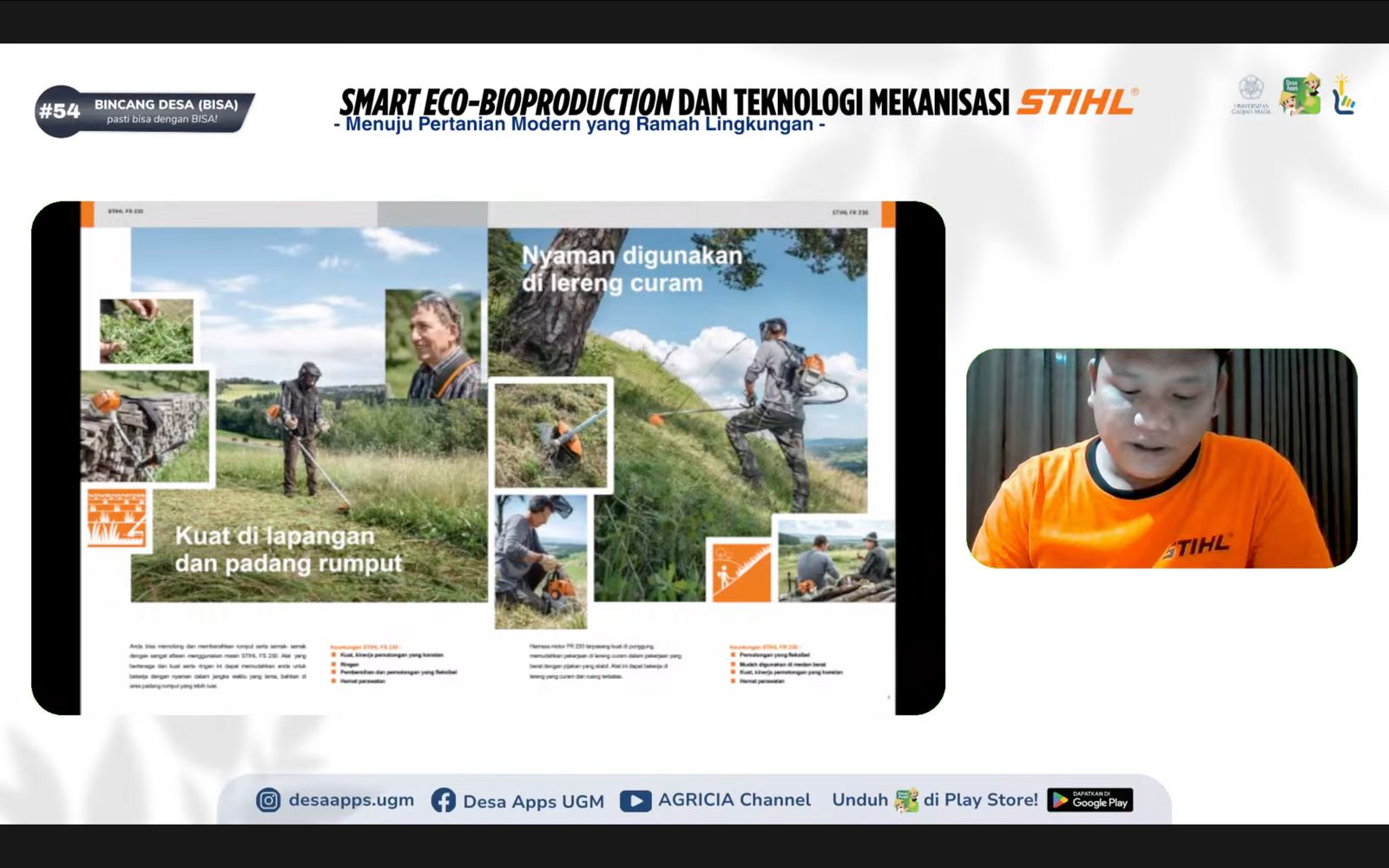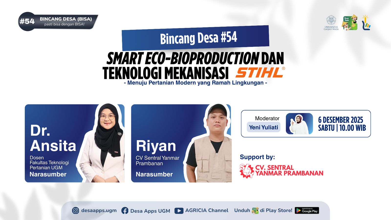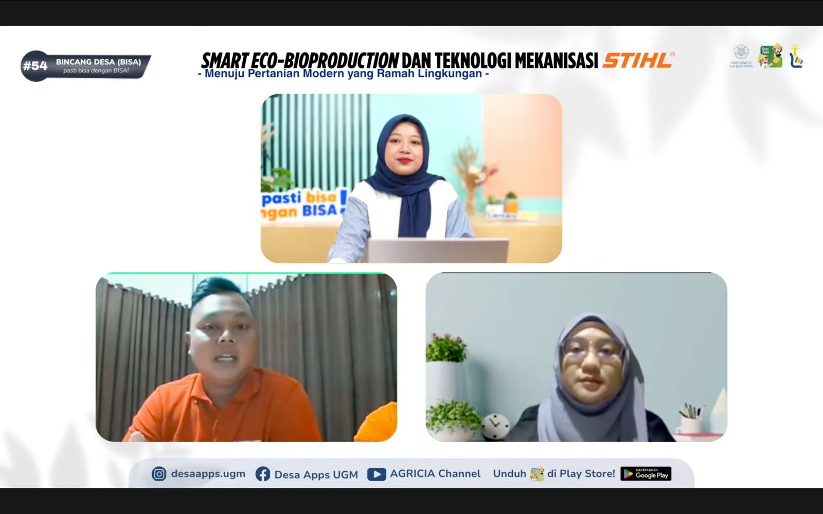 Smart Eco-Bioproduction dan teknologi mekanisasi menjadi kunci utama dalam meningkatkan produktivitas pertanian secara presisi, dengan efisiensi sumber daya yang bijak sambil menjaga kelestarian lingkungan serta kesejahteraan petani. Bincang Desa (BISA) #54 bertajuk “Smart Eco-Bioproduction dan Teknologi Mekanisasi STIHL: Menuju Pertanian Modern yang Ramah Lingkungan” sukses diselenggarakan secara daring pada Sabtu, 6 Desember 2025, pukul 10.00-12.00 WIB melalui platform Zoom Meeting dan siaran langsung Agricia Channel. Antusiasme peserta yang aktif bertanya dan berdiskusi mencerminkan semangat kolaboratif komunitas pertanian kita.