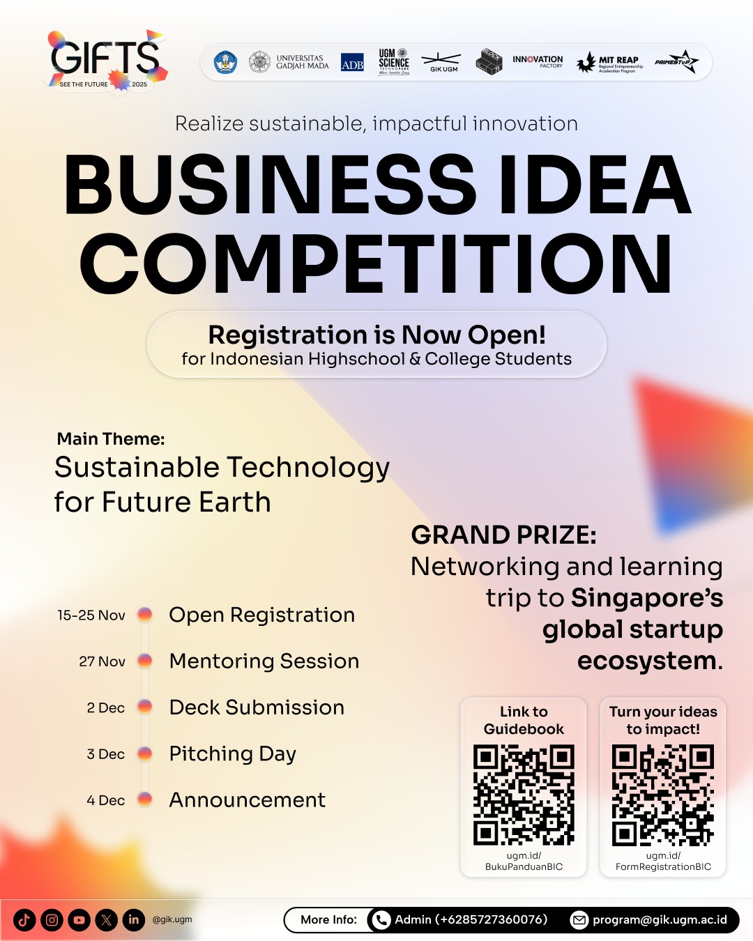Gelanggang Inovasi dan Kreativitas (GIK) UGM, Innovative Academy UGM, BLOCK71, dan Innovation Factory menggelar Business Idea Competition bertema “Sustainable Technology for Future Earth” sebagai rangkaian dari Global Innovation & Future Technology Summit (GIFTS) 2025.
