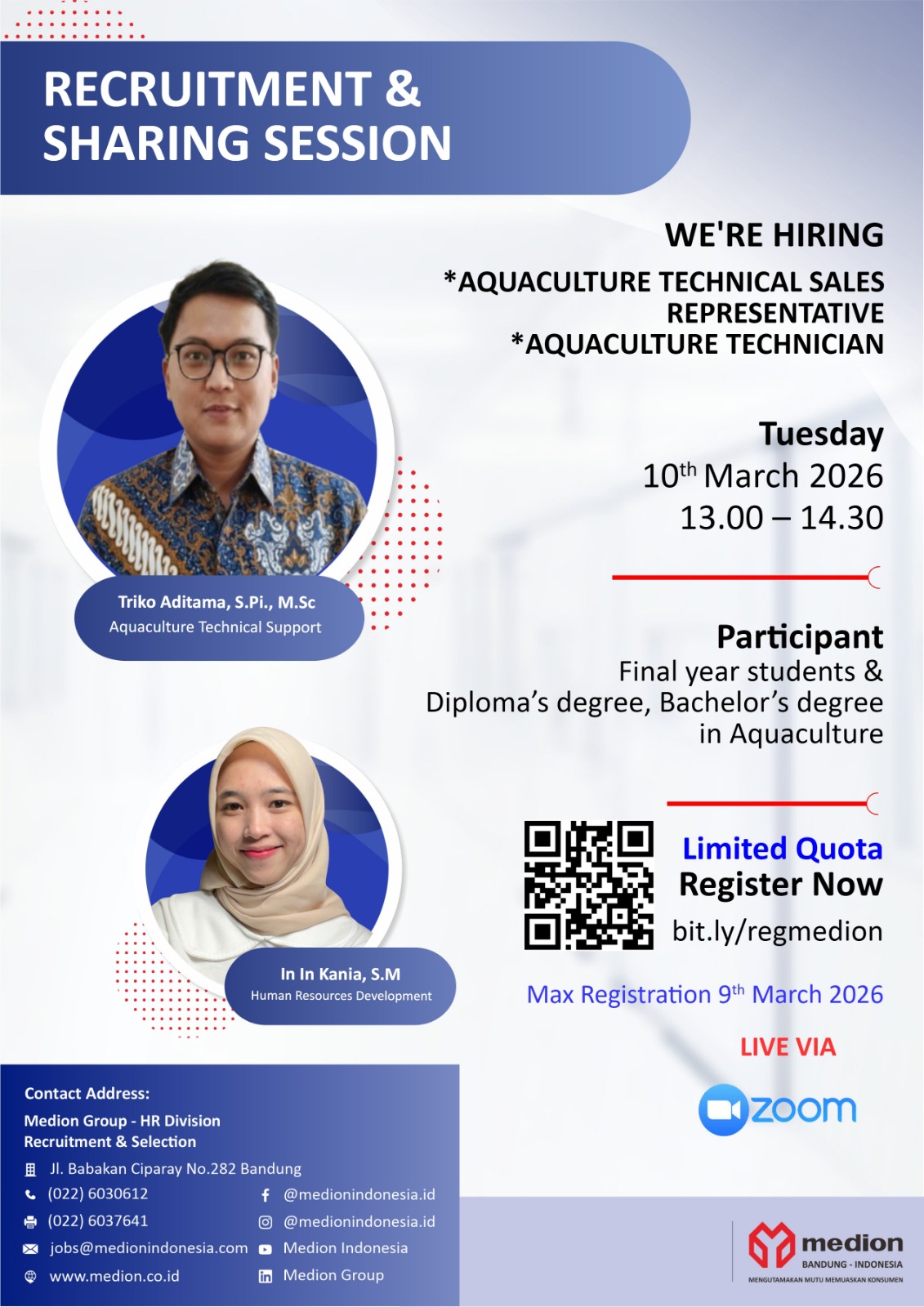 Saat ini perusahaan kami sedang membuka lowongan pekerjaan bagi lulusan jurusan Perikanan. Sehubungan dengan hal tersebut, kami akan mengadakan kegiatan Recruitment & Sharing Session (poster terlampir) yang akan dilaksanakan pada :