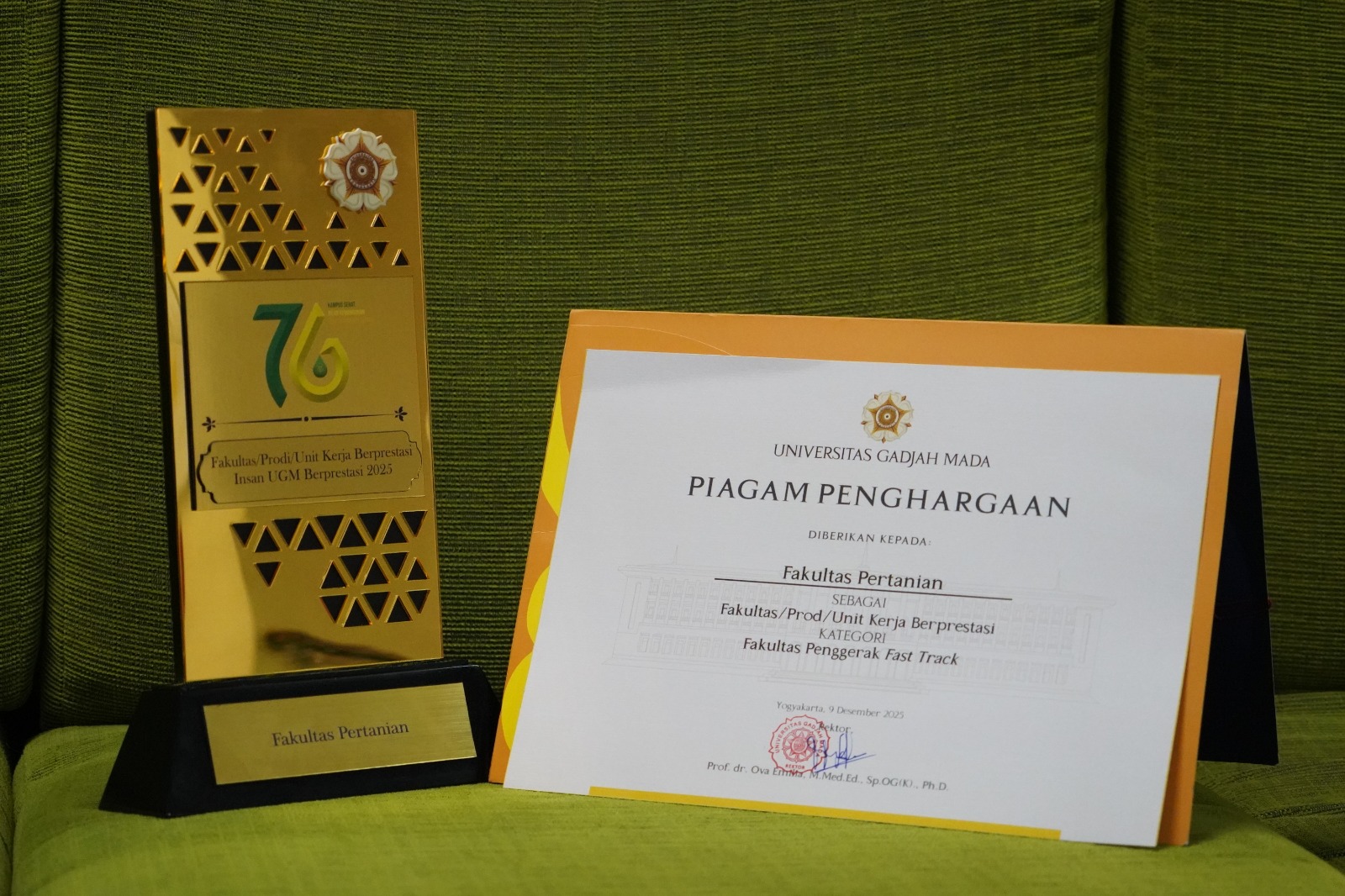 Fakultas Pertanian Universitas Gadjah Mada (Faperta UGM) kembali menorehkan prestasi membanggakan dengan meraih piagam penghargaan sebagai Fakultas/Prodi/Unit Berprestasi kategori Fakultas Penggerak Fast Track. Penghargaan tersebut diserahkan dalam acara Malam Anugerah Insan Berprestasi UGM 2025 yang berlangsung di Grha Sabha Pramana UGM pada Selasa, 9 Desember 2025.