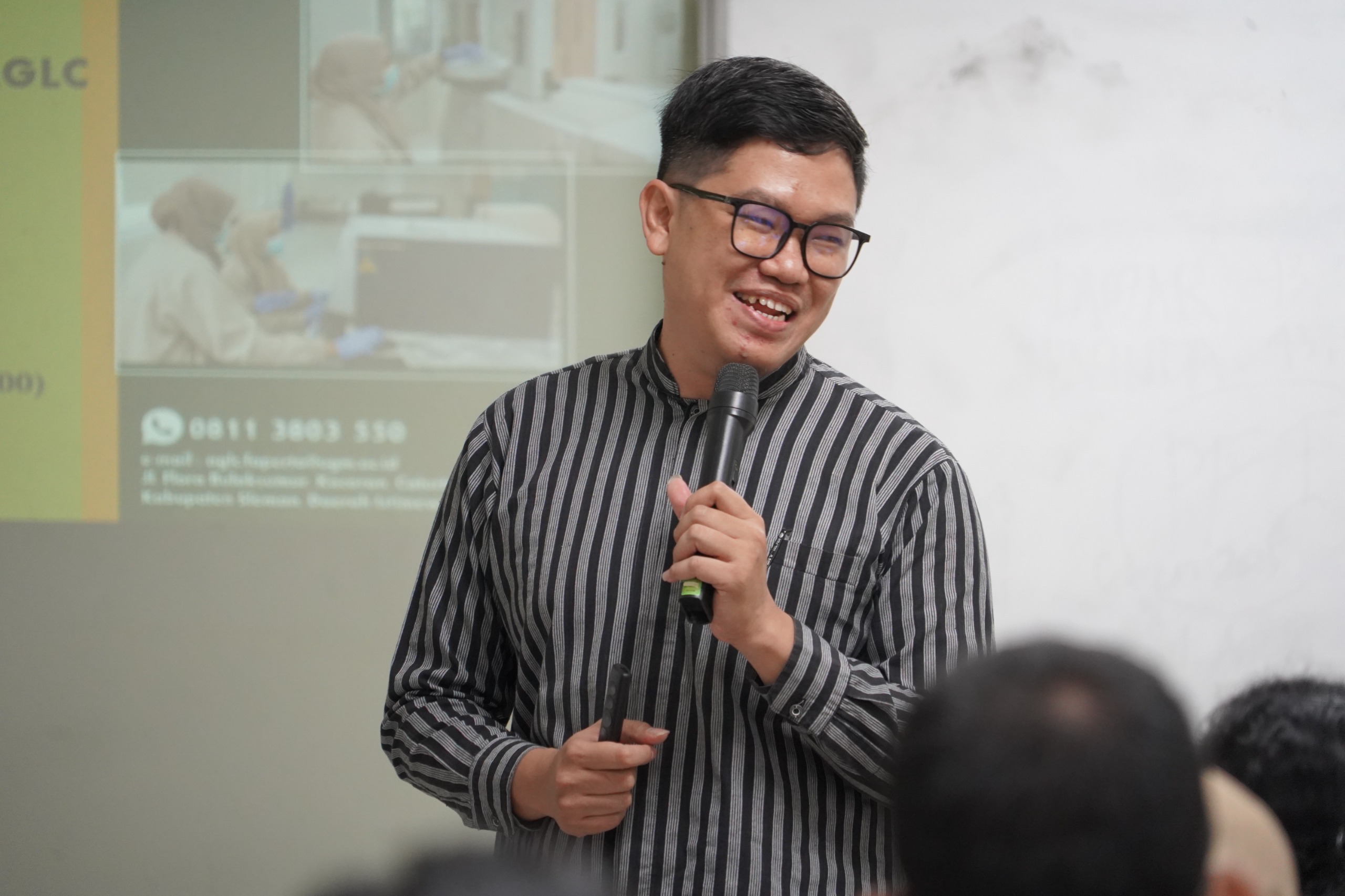Turut hadir juga Manajer AGLC, Mgs. Muhammad Prima Putra, S.Pi., M.Sc., Ph.D. (Departemen Perikanan), yang menjelaskan tentang fasilitas dan layanan laboratorium AGLC. Sosialisasi dilanjutkan oleh Lintang Sukma Surtri Putri selaku Teknisi Laboratorium, dengan menjelaskan terkait Prosedur Pengujian Sampel, Tarif Layanan Pengujian Sampel, Prosedur Sewa Bench Penelitian, Tarif Layanan Sewa Bench Penelitian, hingga Prosedur Sewa Alat Penelitian.