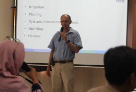 Selanjutnya, Steven Falivene dari NSW DPIRD (Australia) berbagi pengalaman praktik manajemen budidaya jeruk di Australia. Ia menjelaskan sistem produksi hortikultura yang mencakup jarak tanam, mekanisasi, kualitas buah, nutrisi, hingga irigasi. Praktik ini dinilai relevan untuk diadaptasi dalam konteks Indonesia guna meningkatkan produktivitas sekaligus menjaga keberlanjutan.