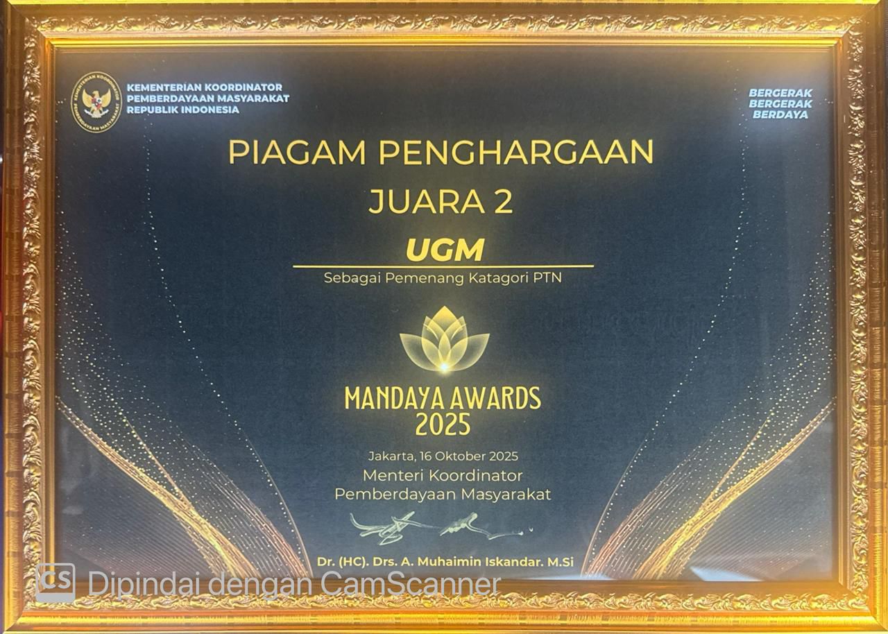 Universitas Gadjah Mada (UGM) kembali mencatatkan prestasi nasional dengan meraih Juara II dalam ajang Mandaya Awards 2025 untuk kategori Perguruan Tinggi Negeri. Penghargaan ini diserahkan langsung oleh Menteri Koordinator Bidang Pemberdayaan Masyarakat Republik Indonesia, Abdul Muhaimin Iskandar, kepada Wakil Rektor Bidang Kemahasiswaan, Pengabdian kepada Masyarakat, dan Alumni UGM, Dr. Arie Sujito, pada Kamis (16/10) di Plaza BP Jamsostek, Jakarta.
